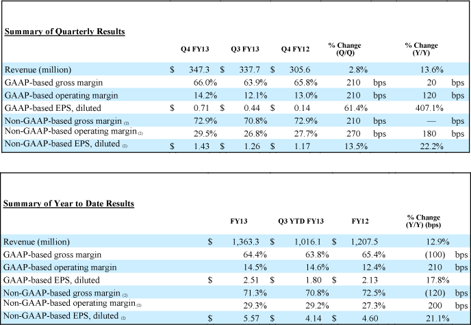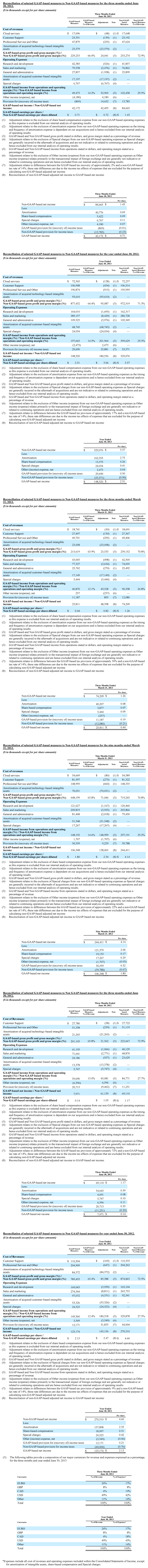 Non-GAAP-based net income and non-GAAP-based EPS are calculated as net income or net income per share on a diluted basis, excluding, the amortization of acquired intangible assets, other income (expense), share-based compensation, and special charges, all net of tax. Non-GAAP-based gross profit is the arithmetical sum of GAAP-based gross profit and the amortization of acquired technology-based intangible assets. Non-GAAP-based gross margin is calculated as non-GAAP-based gross profit expressed as a percentage of revenue. Non-GAAP-based income from operations is calculated as income from operations, excluding, the amortization of acquired intangible assets, special charges, and share-based compensation. Non-GAAP-based operating margin is calculated as non-GAAP-based income from operations expressed as a percentage of revenue.